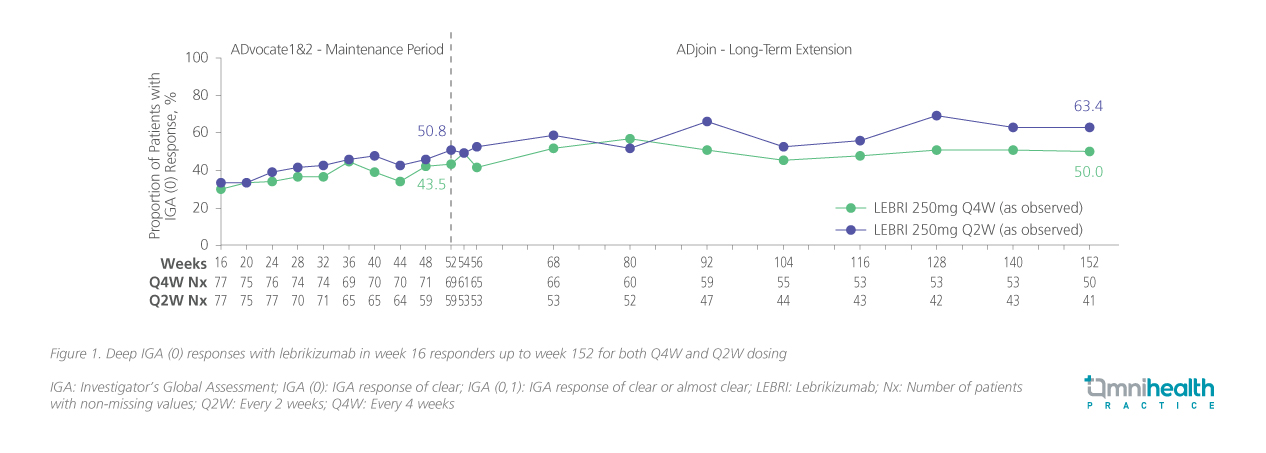 The pivotal ADvocate trials demonstrated lebrikizumab’s ability to deliver rapid and deep responses by week 16, but the key question that followed was whether those gains could be maintained over time. This was the purpose of the ADjoin extension study, which enrolled responders from ADvocate 1 and 2 who had achieved either IGA 0/1 (response of clear or almost clear) or EASI-75 (75% improvement from baseline) at week 16 and assessed the long-term efficacy and safety of 3 years of continuous treatment with lebrikizumab.19 These patients transitioned into long-term maintenance, receiving lebrikizumab at either 250mg every two weeks (Q2W) or every four weeks (Q4W).19