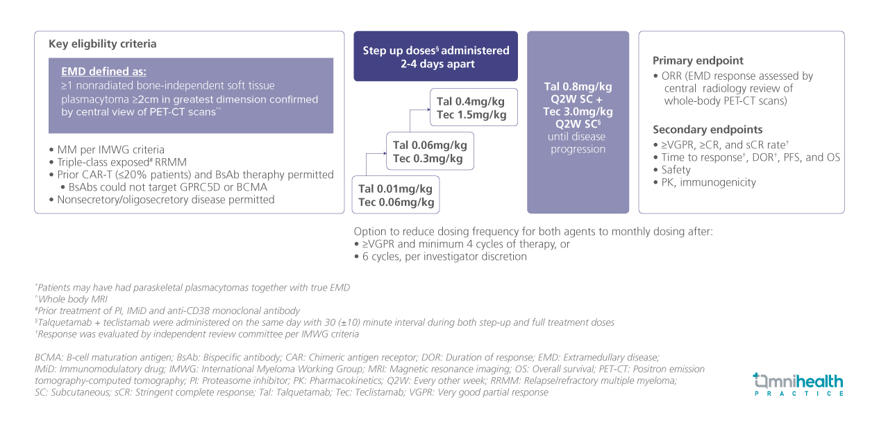 Building on preliminary data from the RedirecTT-1 phase 1 trial, the phase 2 RedirecTT-1 trial enrolled patients aged ≥18 years with measurable MM with true EMD, defined as ≥1 non-radiated bone-independent soft tissue plasmacytoma ≥2cm in greatest dimension as confirmed by central review of positron emission tomography–computed tomography (PET-CT) scans.1 Patients with triple-class-exposed relapsed/refractory MM (RRMM) were included.1 Prior CAR-T or BsAb therapy (not targeted at GPRC5D or BCMA) and those with non-secretory or oligosecretory disease were permitted.1 Participants received maintenance therapy with talquetamab (0.8mg/kg) + teclistamab (3.0mg/kg), administered subcutaneously every two weeks, following a step-up dosing regimen, and continued until disease progression.1
