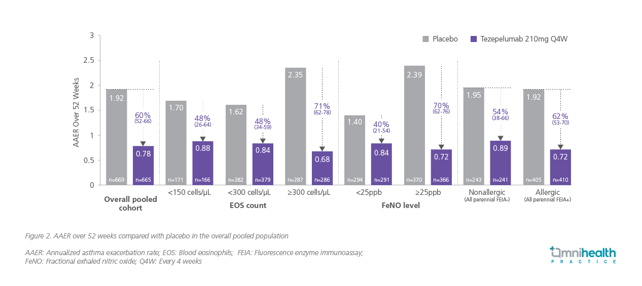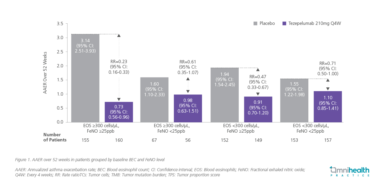 In the pivotal NAVIGATOR trial, tezepelumab reduced the annualized asthma exacerbation rate (AAER) by 56% compared with placebo (rate ratio [RR]=0.44; 95% CI: 0.37-0.53; p<0.001), with consistent benefits across blood eosinophil and FeNO subgroups (figure 1).2