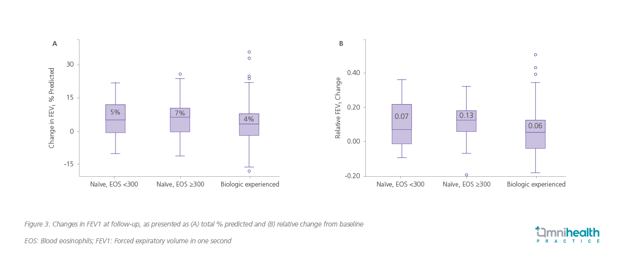 Real-world data further supported these findings, demonstrating significant overall improvements in lung function after approximately one year of tezepelumab treatment.1 Median FEV1 % predicted increased from 65% to 74%, and absolute FEV1 improved from 1.69L to 1.90L (both p<0.01).1 Directional improvements were observed across all patient subgroups, including those with prior biologic exposure and across eosinophil strata (<300 and ≥300 cells/μL), with the largest numerical gains noted among biologic-naïve patients with higher baseline eosinophil counts (figure 3).1