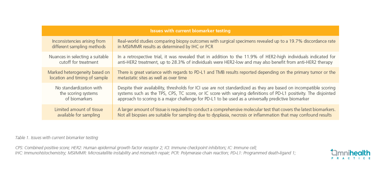 G/GEJ cancers are conventionally classified into distinct molecular subtypes.3 Biomarker-guided therapy is the mainstay of treatment, and the combination of histological and molecular reporting helps inform treatment selection.1,4 Established biomarkers such as programmed death-ligand 1 (PD-L1), human epidermal growth factor receptor 2 (HER2), and microsatellite instability and mismatch repair (MSI/MMR) tests are invaluable in treatment selection according to the American Society of Clinical Oncology (ASCO) treatment guidelines.1,4 However, Prof. Fassan acknowledged that there are many shortcomings with current testing modalities that remain unaddressed as outlined in (table 1).2,6,7