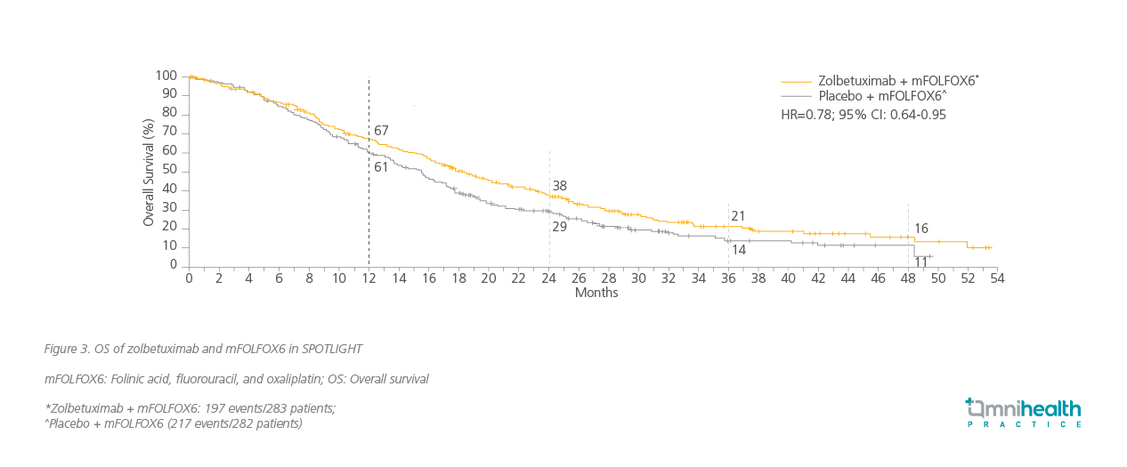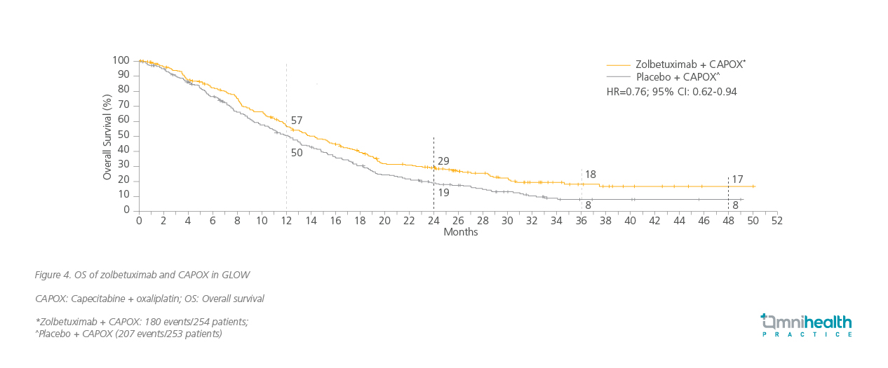 The latest trials have revealed encouraging progression-free survival (PFS) and OS outcomes with targeted therapy, specifically zolbetuximab, when used in combination with chemotherapy.17 Prof. Fassan highlighted the outcomes of 2 trials using different chemotherapy combination regimens. SPOTLIGHT is a phase 3 trial in which patients with locally advanced unresectable or metastatic G/GEJ adenocarcinoma and were CLDN18.2-positive and HER2-negative were given zolbetuximab and mFOLFOX6 as the first-line treatment.17 Similarly, in GLOW, another phase 3 trial, patients with locally advanced unresectable or metastatic G/GEJ adenocarcinoma and were CLDN18.2-positive and HER2-negative were given zolbetuximab and CAPOX as first-line treatment. Major improvements in OS outcomes were achieved in the primary analysis of both trials (figure 3 and 4) along with significant improvements in PFS in SPOTLIGHT (HR=0.73; 95% CI: 0.59-0.91) and GLOW (HR=0.69; 95% CI: 0.55 0.86) respectively.17