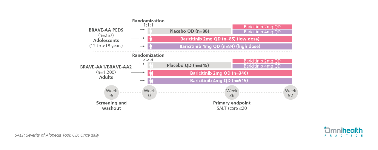 The BRAVE-AA program included two adult studies (BRAVE-AA1 and BRAVE-AA2) and one adolescent study (BRAVE-AA-PEDS).1 Common inclusion criteria required a SALT score ≥50 at screening and baseline, an AA episode lasting >6 months to <8 years, and no spontaneous improvement within 6 months.1 For BRAVE-AA-PEDS, eligible patients were aged 12 to <18 years, weighed ≥30kg, had a confirmed AA diagnosis for ≥1 year, and had failed more than one previous therapy.1 History of psychological counseling and evidence of psychological distress related to AA were also criteria for inclusion.1 For BRAVE-AA1 and BRAVE-AA2, adults aged ≥18 years (males <60, females <70) were eligible.1 Compared to the adult population, a greater proportion of adolescents had very severe baseline disease, atopic dermatitis, and asthma.1