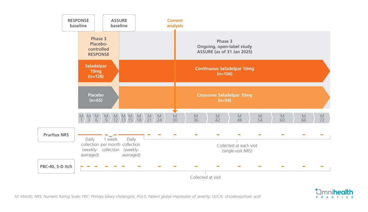 Outcomes assessed included changes in pruritus measured by the NRS, the 5-D Itch scale, and the PBC-40 itch domain over 30 months of treatment.1 The percentage of patients achieving a clinically meaningful improvement of ≥3 points on the NRS was also evaluated, along with comparisons between single-visit NRS scores and weekly averages in the ASSURE phase.1