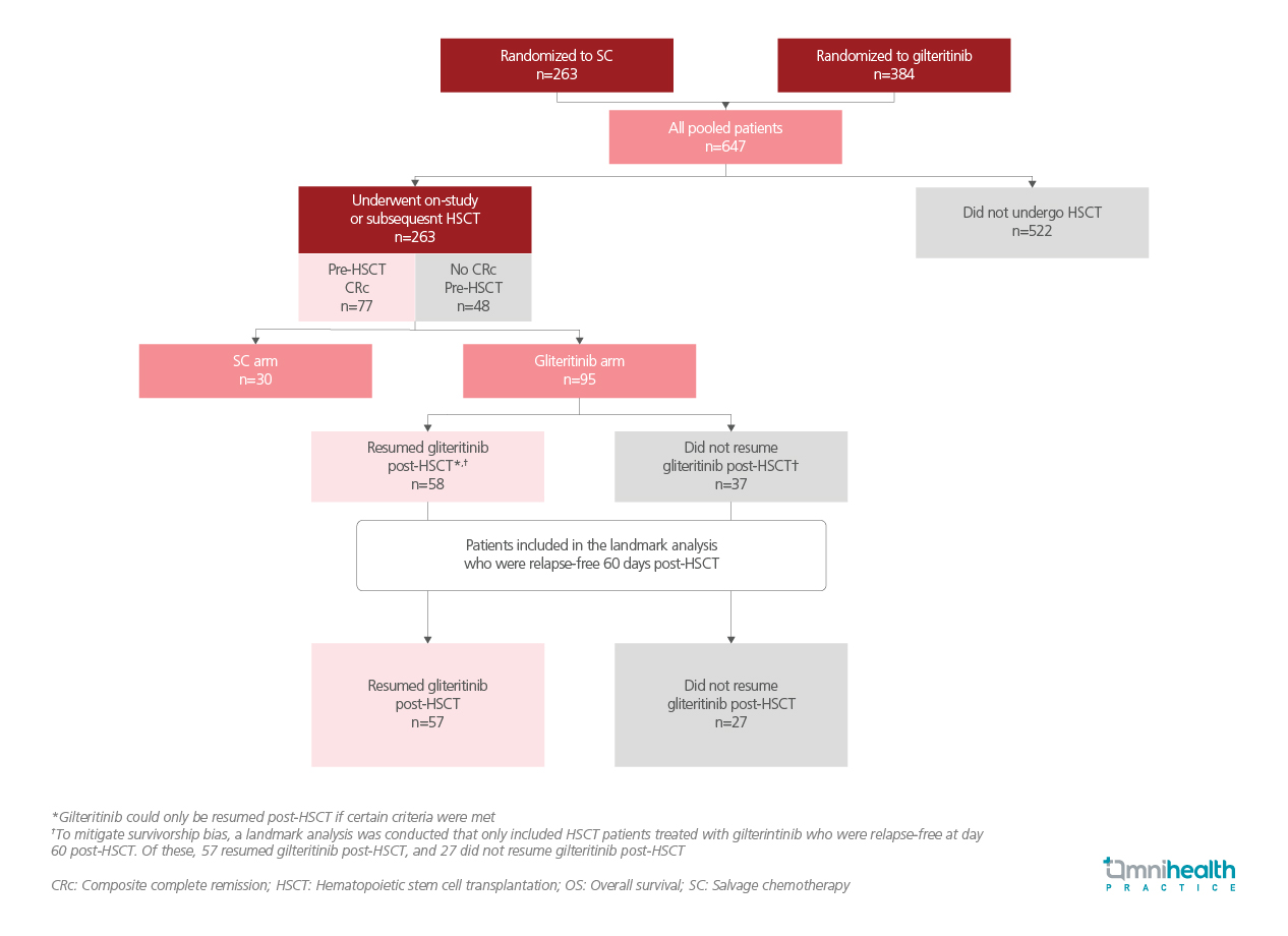 A landmark analysis was subsequently conducted within the gilteritinib arm, including only patients who remained relapse-free for at least 60 days after HSCT.1 The key outcomes assessed were OS evaluated by HSCT status, pre-HSCT response irrespective of treatment, and relapse-free survival (RFS) and OS by gilteritinib resumption post-HSCT among gilteritinib-treated patients1