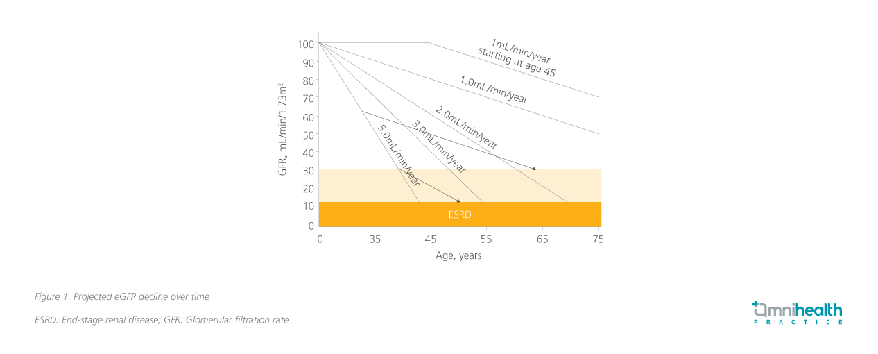 The prevalence of undiagnosed CKD is alarmingly high, particularly among patients with CRM conditions such as CV disease (CVD), hypertension, and diabetes.1 Reports indicate that undiagnosed CKD may be as high as 95% in these high-risk populations.1 Despite the risk of adverse renal outcomes in these patients, current diagnostic practices are inadequate and primarily focus only on eGFR.5 However, eGFR alone is insufficient for timely CKD diagnosis, Prof. Wanner emphasized that many patients may not exhibit clear signs of kidney disease until significant damage has occurred, leading to delays in diagnosis and treatment. When medical intervention is initiated early in the disease course, the need for dialysis may be delayed.6 Initiating treatment when renal function is preserved at 60mL/min/1.73m² provides more years before dialysis is needed compared to starting treatment at 30mL/min/1.73m², as illustrated in figure 1.7